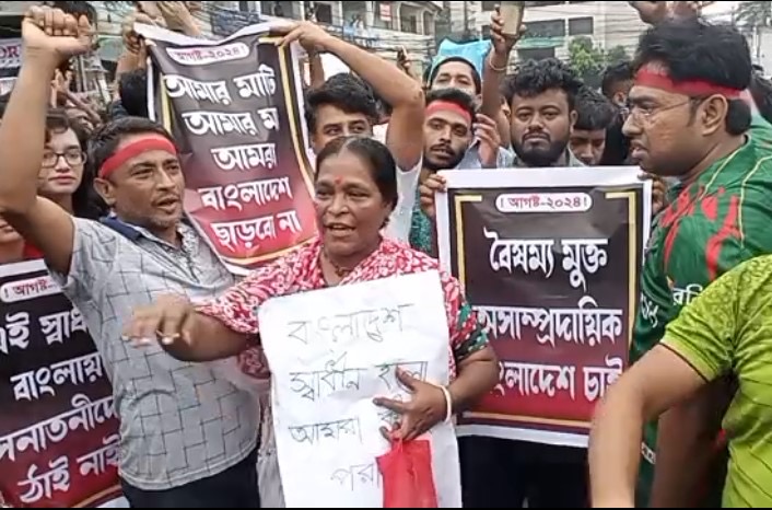 বৈষম্যহীন ছাত্র আন্দোলনে শেখ হাসিনা সরকারের পতনের পর সারাদেশে চলমান সহিংসতা, ভাংচুর, লুটপাট, অগ্নি সংযোগ ও অরাজকতায় ক্ষতিগ্রস্ত ও ভীতসন্ত্রস্ত সংখ্যালঘু সম্প্রদায়ের উদ্দোগে আজ দুপুর পরবর্তি মু্গ্ধ চত্বর সাবেক শিববাড়ী মোড়ে হাজার হাজার সংখ্যালঘু সম্প্রদায়ের মানুষের উপস্থিতিতে বিক্ষোভ ও সমাবেশ অনুষ্ঠিত হয়। সমাবেশে সারাদেশে চলমান পরিস্থিতিতে তাদের নিরাপত্তা নিশ্চিত ও প্রতিনিয়ত তাদেরকে হেয়প্রতিপন্ন করার তিব্র প্রতিবাদ ও ধিক্কার জানায় সংখ্যালঘুরা।