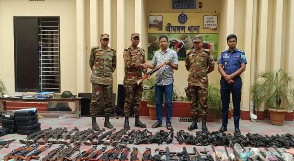 মৌলভীবাজারে শ্রীমঙ্গল থানা প্রাঙ্গনে সরকারি অস্ত্র ও বেসরকারি লোকজনের অস্ত্র থানায় জমা দেওয়া হয়। এ সময় অস্ত্রের সাথে গুলাবারুদ ও বিভিন্ন ইলেকট্রনিক ডিভাইস থানায় বুঝিয়ে দেয়া হয়। মঙ্গলবার ১৩ আগস্ট বিকেলে দেওয়া হয়।মৌলভীবাজার পুলিশ সুপার (শ্রীমঙ্গল সার্কেল) আনিসুর রহমান বলেন, গত পাঁচ আগস্ট সরকার পতনের শ্রীমঙ্গল থানায় হামলা হয়। স্থানীয় মানুষের সহযোগিতায় আমাদের পুলিশ বাহিনী থানা থেকে অনেক কষ্টে বের হয়। পরে আমাদের অনুরোধের প্রেক্ষিতে সেনাবাহিনী থানায় থাকা অস্ত্র ও অন্যান্য সামগ্রী উদ্বার করে তাদের হেফাজতে রাখেন। এদিকে মঙ্গলবার সন্ধ্যায় এগুলো আমরা তাদের কাছ থেকে বুঝে পেয়েছি। এখন আমরা আইন শৃঙ্খলা রক্ষায় কাজ শুরু করতে পারবো। এ ব্যাপারে শ্রীমঙ্গল আর্মি ক্যাম্প কমান্ডার মেজর মো: মেজবাউর রহমান বলেন, বিগত ৫ আগস্ট বৈষম্যবিরোধী ছাত্রদের বিজয় মিছিলে অজ্ঞাত কিছু লোক প্রবেশ করে শ্রীমঙ্গল থানা ক্যাম্পে আক্রমন করতে চায়। দ্রুত সেনাবাহিনী ও স্থানীয় কিছু মানুষ এসে তাদের নিয়ন্ত্রনের চেষ্টা করেন। এসময় শ্রীমঙ্গল থানা পুলিশের সদস্যরা আত্মরক্ষার্থে সকল অস্ত্র, অস্ত্রাগারে রেখে থানা থেকে সরে যান। পরে বাংলাদেশ সেনাবাহিনীর পক্ষ থেকে পরিস্থিতি নিয়ন্ত্রনে এনে অস্ত্রাগার থেকে সকল অস্ত্র আমাদের হেফাজতে নেই। যা আজ ফিরিয়ে দেই।