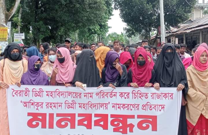 এসময় সাবেক এমপি এইচএন আশিকুর রহমানকে চিহ্নিত রাজাকার আখ্যা দিয়ে বক্তারা বলেন, ঐতিহ্যবাহী এই কলেজ নির্মানে সাবেক সংসদ সদস্যের কোন ভূমিকা নাই। এলাকাবাসীর উদ্যোগে ১৯৯৪ সালে সকলের সহযোগিতায় বৈরাতীহাটের প্রান কেন্দ্রে কলেজটি প্রতিষ্ঠা করা হয়েছে বলেই কলেজটির নাম বৈরাতী ডিগ্রী মহাবিদ্যালয় করা হয়। অধ্যক্ষ হাসান ইমাম শামীমের যোগসাজসে কলেজের নাম পরিবর্তন করা হয়েছে বলে অবিলম্বে তার পদত্যাগ দাবী করেন বিক্ষোভকারীরা। এছাড়াও অধ্যক্ষের অনিয়ম, দূর্নীতি, স্বেচ্ছাচারিতা সহ নিয়োমিত কলেজে না আসার তীব্র সমালোচনা করেন বক্তারা।