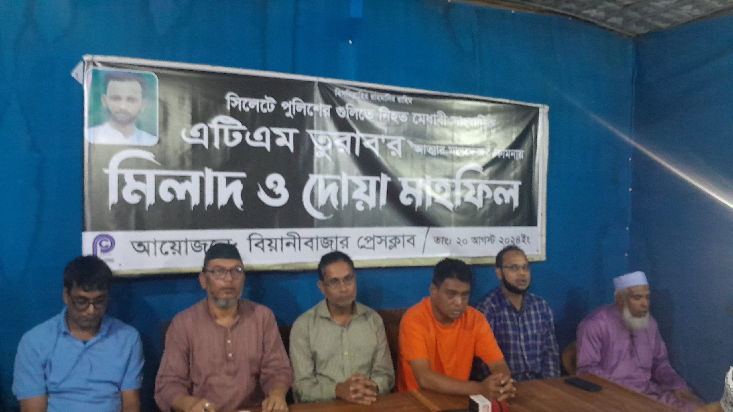 বিয়ানীবাজার প্রেসক্লাবের সদস্য সাংবাদিক এটিএম তুরাব (আবু তাহের মোহাম্মদ তুরাব)-এর মাগফেরাত কামনায় মিলাদ ও দোয়া মাহফিল অনুষ্ঠিত হয়েছে। এর আগে সাংবাদিক তুরাবের কর্মময় জীবন নিয়ে অনুভূতি প্রকাশ করেন স্থানীয় সাংবাদিকরা। তারা বলেন, অল্পদিনের ব্যবধানে এটিএম তুরাব সাংবাদিকতায় বিশেষ স্থান দখল করে নেন। পেশাগত দায়িত্বকালে তার প্রতি পুলিশের এমন নৃশংসতা মেনে নেয়া যায়না। তারা তুরাবকে গুলি করে হত্যার ঘটনার নিন্দা জানান এবং দোষীদের দৃষ্টান্তমুলক শাস্তির দাবী করেন।