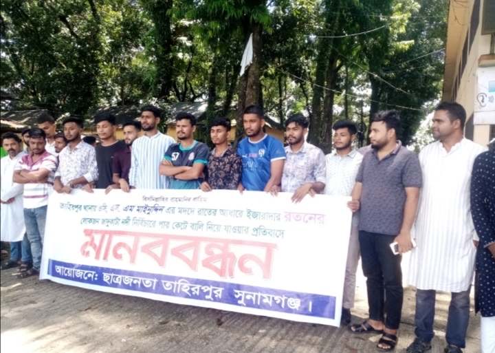 সুনামগঞ্জের তাহিরপুর থানার ওসি মাইন উদ্দিনের অপসারণের দাবিতে মানববন্ধন করেছে ছাত্রজনতা। তাদের অভিযোগ থানার ওসি মাইন উদ্দিনের মদদে যাদুকাটা নদীতে রানু মেম্বার তার লোকজন নিয়ে নির্বিচারে নদীর পাড় কেটে বালু নিয়ে যায়। শনিবার দুপুর ১২টায় উপজেলা পরিষদ চত্বরে উপজেলা বৈষম্য বিরোধী ছাত্র আন্দোলনের সমন্বয়ক আজিজুর রহমান কাউসারের নেতৃত্বে এ মানববন্ধন অনুষ্ঠিত হয়। মানববন্ধনে বক্তারা বলেন, তাহিরপুর উপজেলার সীমান্ত নদী যাদুকাটায় থানার অফিসার ইনচার্জ (ওসি) মাইন উদ্দিনের মদদে বাদাঘাট ইউপি সদস্য রানু মিয়া (রানু মেম্বার) প্রকাশ্যে পাড় কেটে বালু তোলায় অন্তত ২০ থেকে ২৫ টি গ্রামের মানুষ বসতবাড়ি হারানোর ঝুঁকিতে পড়েছেন। তাদের এমন কর্মকাণ্ডে ইতিমধ্যে নদীর পাড়ের অনেক বাড়িঘর বিলীন হয়ে গেছে। অসংখ্য বার থানা প্রশাসনকে অবগত করলেও ওসি পদক্ষেপ না নিয়ে উল্টো রানু মেম্বারের কাছ থেকে অনৈতিক সুবিধা নিয়ে পাড় কাটায় সহযোগীতা করছেন। পাড় কাটার মূল হোতা রানু মেম্বার যাদুকাটা নদীর ইজারাদার রতন মিয়ার লোক বলেও অভিযোগ করেন তারা। ছাত্ররা দাবি করে বলেন, যাদুকাটা নদীর পাড় কাটার মদদ দাতা ওসি মাইন উদ্দিনকে দ্রুত অপসারণ করতে হবে। পাড় কাটার মূল হোতা রানু মেম্বারকে দ্রুত গ্রেফতার করে শাস্তির আওতায় আনতে হবে। এবং যাদুকাটা নদীর ইজারা বাতিল করতে হবে। তা নাহলে পাড় কাটার কারনে যাদুকাটা নদীর পাড়ের গ্রামগুলো বিলীন হয়ে যাবে। প্রশাসন ওসি মাইন উদ্দিন কে দ্রুত অপসারণ না করলে কটোর আন্দোলনের হুশিয়ার দেন ছাত্ররা। মানববন্ধন শেষে ছাত্ররা উপজেলা নির্বাহী কর্মকর্তা বরাবর স্মারকলিপি প্রদান করেন। এবিষয়ে যাদুকাটা নদীর ইজারাদার রতন মিয়া বলেন, অভিযুক্ত রানু মেম্বার আমার লোক না। রানু মেম্বার সহ এই পাড়ের কয়েকজন নেতা এর সাথে জড়িত। আমার লোকজন পাড় কাটায় বাধা দিতে গেলে তাদের উপর হামলা করে তারা। আমি সব সময় পাড় কাটার বিপক্ষে। এর আগে কয়েকবার উপজেলা প্রশাসন ও জেলা প্রশাসক বরাবর পাড় কাটার বিরুদ্ধে লিখিত অভিযোগও করেছি। যারা পাড় কাটার সাথে জড়িত তাদের বিরুদ্ধে আইনগত ব্যবস্থা গ্রহন করা হউক। তাহিরপুর থানা অফিসার ইনচার্জ (ওসি) মাইন উদ্দিন বলেন, আমি গতকালকে পাড় কাটা বন্ধ করতে নিষেধ দিয়ে এসেছি। যারা পাড় কাটে তাদের বিরুদ্ধে ব্যাবস্থা নেওয়া হবে। পাড় কাটা বন্ধ হলে অনেকের স্বার্থে আঘাত আসবে। যাদের স্বার্থে আঘাত আসবে তারাই ছাত্রদের দিয়ে মানববন্ধন করিয়েছে।