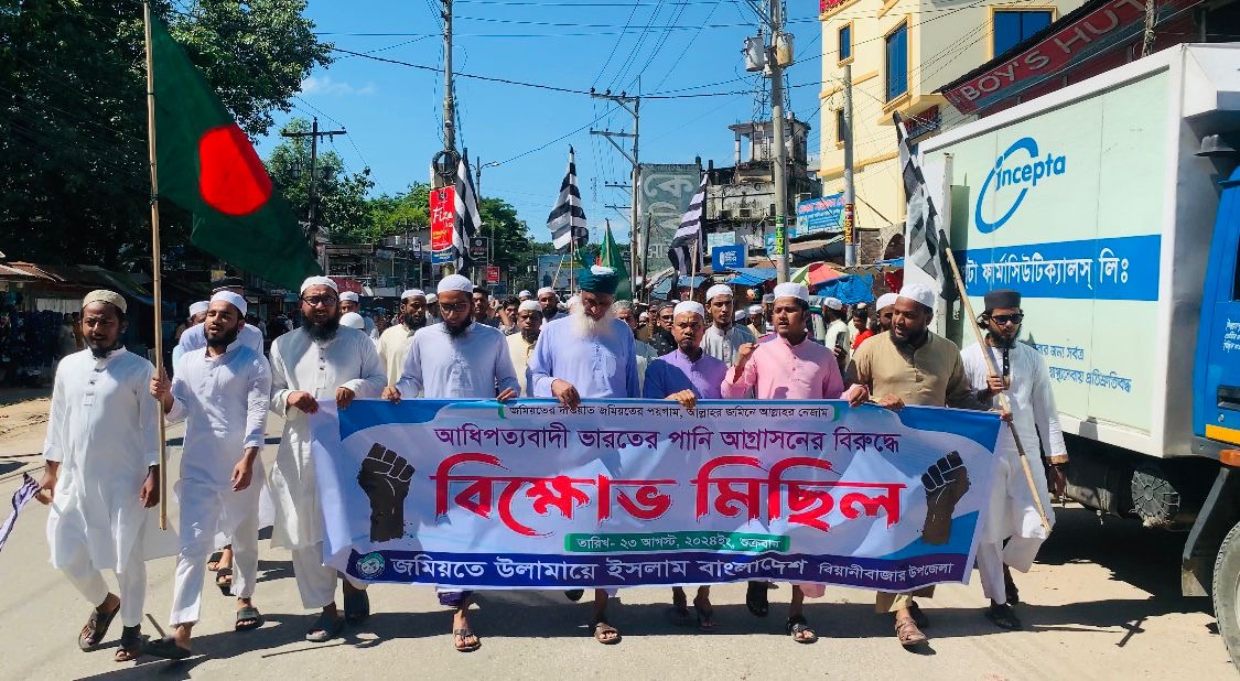 বাংলাদেশ-ভারত অভিন্ন নদীর ন্যায্য হিস্যা নিশ্চিত করা, উজানে বাঁধ বন্ধ করা সহ আধিপত্যবাদী ভারতের আগ্রাসনের বিরুদ্ধে বিক্ষোভ মিছিল করেছে জমিয়তে উলামায়ে ইসলাম বাংলাদেশ বিয়ানীবাজার উপজেলা।