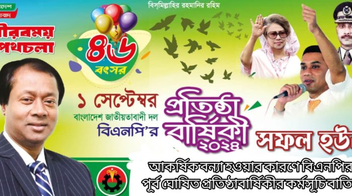 পহেলা সেপ্টেম্বর ২০২৪ (রবিবার) বাংলাদেশ জাতীয়তাবাদী দল বিএনপির ৪৬ তম প্রতিষ্ঠা বার্ষিকী উপলক্ষে দলীয় বিভিন্ন কর্মসূচি আয়োজন থাকলেও এই মুহূর্তে দেশের কয়েক জেলায় আকর্ষিক বন্যা হওয়ার কারণে বিএনপির পূর্ব