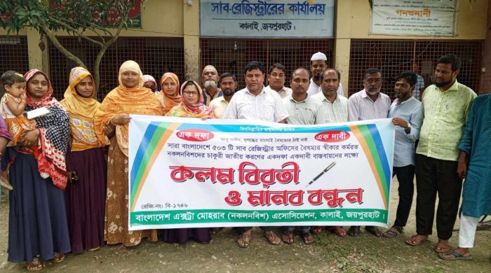 জয়পুরহাটের কালাই উপজেলা বাংলাদেশ এক্সট্রা মোহরাব ( নকলনবিশ) এসোসিয়েশনের আয়োজনে ২৮শে আগস্ট ২০২৪ বুধবার সকাল ১১ টায় সারা বাংলাদেশে ৫০৩ টি সাব-রেজিস্টার অফিসের বৈষম্যর স্বীকার কর্মরত নকল নবিশের চাকুরী জাতীয়