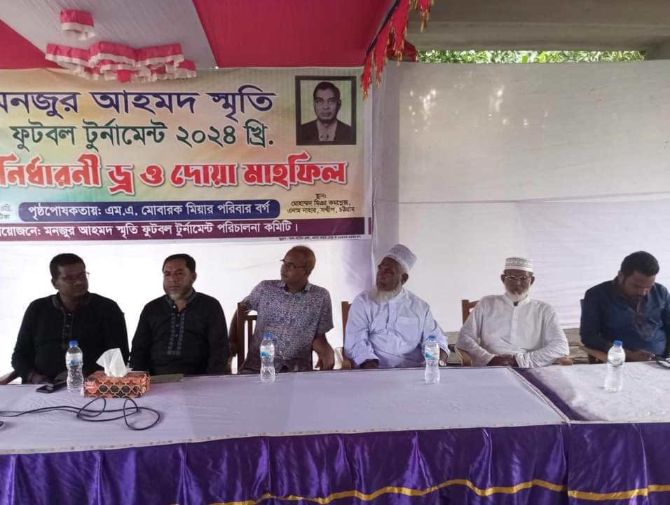 সন্দ্বীপ উপজেলার এম.এ মোবারক মিয়া পরিবারের পৃষ্ঠপোষকতায় ও মঞ্জুর আহমদ স্মৃতি ফুটবল টুর্নামেন্ট পরিচালনা কমিটির আয়োজনে ৩১ আগষ্ট শনিবার বিকাল ৪টায় মঞ্জুর আহমদ স্মৃতি ফুটবল টুর্নামেন্ট ২০২৪ এর গ্রুপ নির্ধারণ দোয়া মাহফিল এনাম নাহার মোড় মোহাম্মদ মিয়া কমপ্লেক্সের ২য় তলায় অনুষ্ঠিত হয়েছে।