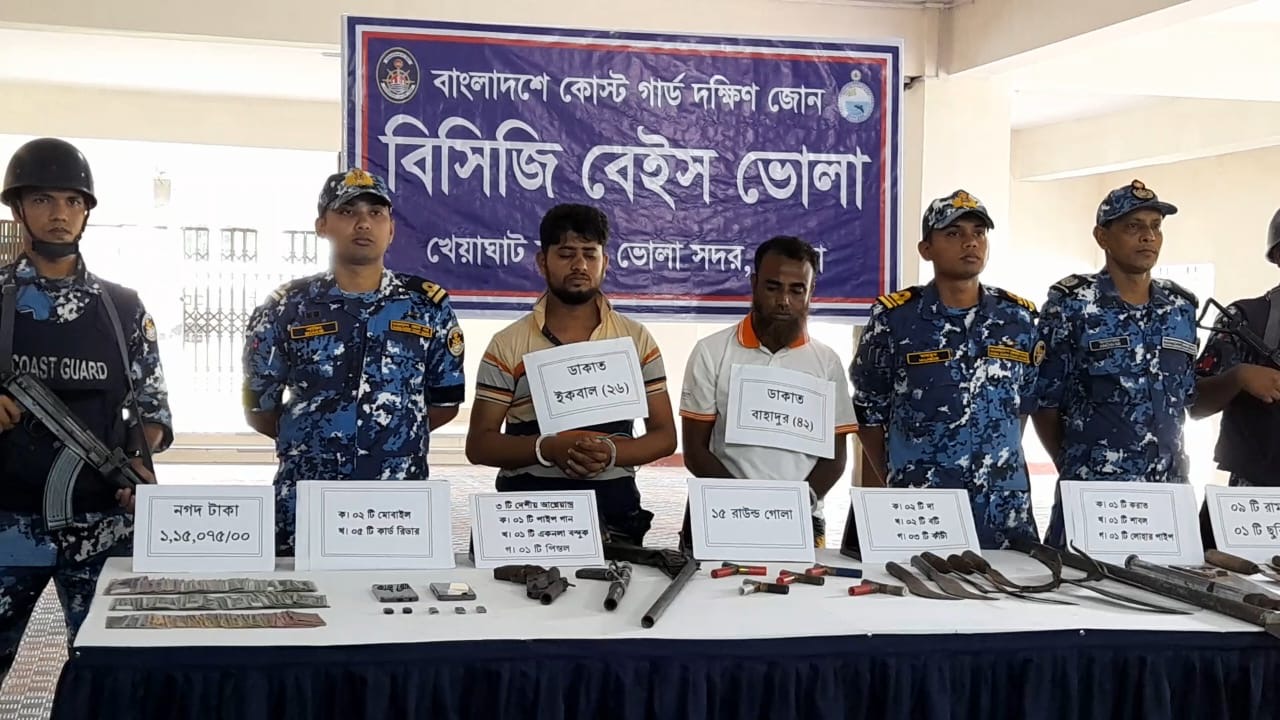 ভোলায় গোপন সংবাদের ভিত্তিতে অভিযান চালিয়ে বিপুল পরিমাণ দেশীয় অস্ত্রসহ দুই জলদস্যু কে আটক করেছে বাংলাদেশ কোস্ট গার্ড দক্ষিন জোন।