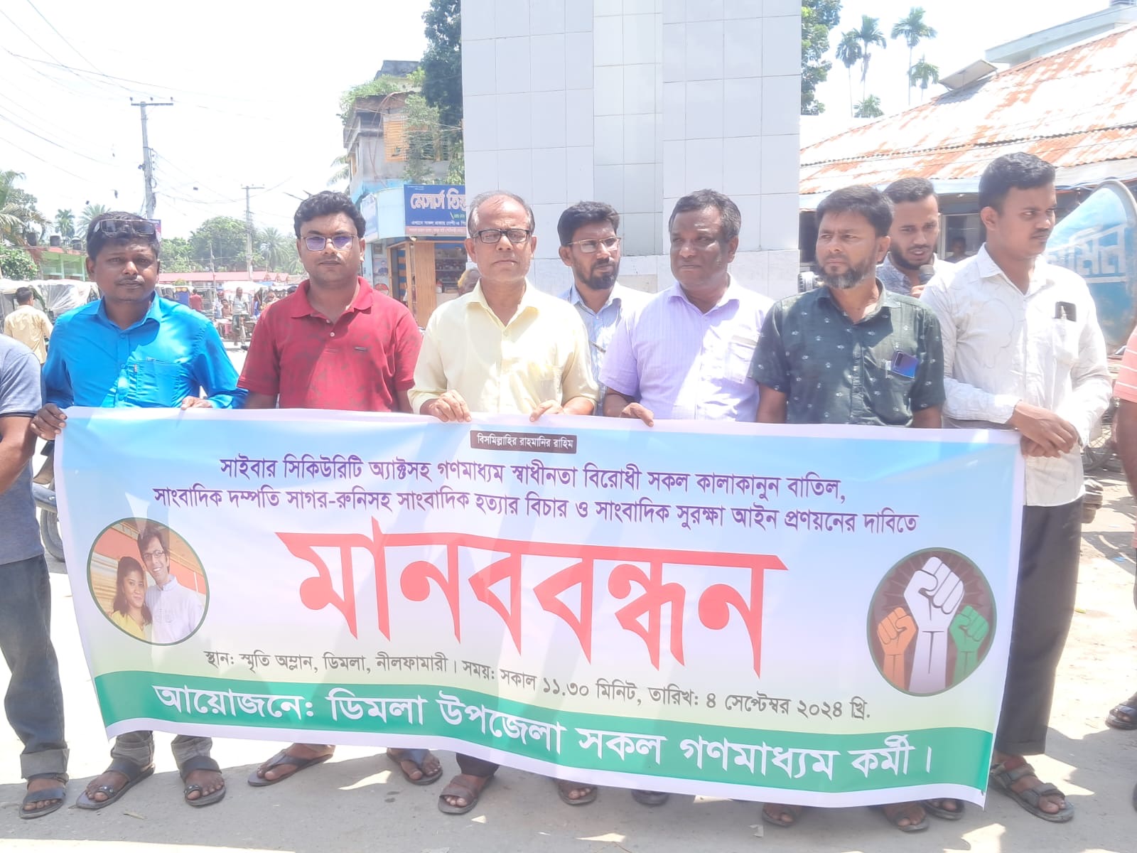 সাইবার সিকিউরিটি অ্যাক্টসহ গণমাধ্যমের স্বাধীনতাবিরোধী সব কালাকানুন বাতিল, সাংবাদিক দম্পতি সাগর-রুনিসহ সকল সাংবাদিক হত্যার বিচার ও সাংবাদিক সুরক্ষা আইন প্রণয়নের দাবিতে নীলফামারীর ডিমলায় মানববন্ধন ও সমাবেশ করেছেন সাংবাদিকরা।