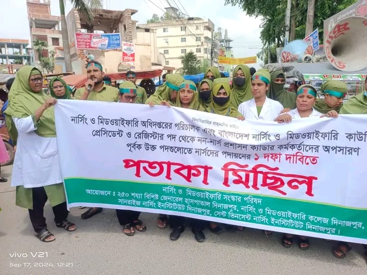 মঙ্গলবার (১৭ সেপ্টেম্বর ২০২৪) সকাল ১১টায় ২৫০ শয্যাবিশিষ্ট দিনাজপুর জেনারেল হাসপাতালের সামনে জেনারেল হাসপাতালের নার্সিং কর্মকর্তা ও নার্সিং শিক্ষক-শিক্ষার্থীরা মাথায় পতাকা বেধে মিছিলে অংশ নেন ও বিক্ষোভ করেন।এতে যোগ দেয় জেনারেল হাসপাতালের নার্সিং কর্মকর্তা, দিনাজপুর নার্সিং ও মিডওয়াইফারি কলেজের শিক্ষক-শিক্ষার্থী, সানরাইজ নার্সিং ইনস্টিটিউট ও সেন্ট ভিনসেট নার্সিং ইনস্টিটিউটের শিক্ষার্থীরা। তারা নার্সিং ও মিডওয়াইফারি অধিদপ্তরের পরিচালক, বাংলাদেশ নার্সিং ও মিডওয়াইফারি কাউন্সিলের প্রেসিডেন্ট ও রেজিস্ট্রারের পদ থেকে নন-নার্স প্রশাসন কর্মকর্তাদের অপসারণের দাবিতে বিভিন্ন শ্লোগান দেন।