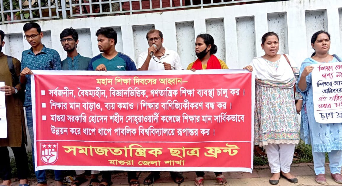 মাগুরায় ১৭ সেপ্টেম্বর মহান শিক্ষা দিবস উপলক্ষে সর্বজনীন, বৈষম্যহীন, বিজ্ঞানভিত্তিক, গণতান্ত্রিক শিক্ষা ব্যবস্থা চালু করা, শিক্ষার মান বাড়ানো, ব্যয় কমানো, শিক্ষার বাণিজ্যিকীকরণ বন্ধ করাসহ বিভিন্ন দাবিতে সমাজতান্ত্রিক ছাত্র ফ্রন্ট মাগুরা জেলা শাখার উদ্যোগে (১৭ সেপ্টেম্বর) ১২ টায় দিক মাগুরা শহরের চৌরঙ্গী মোড়ে প্রেসক্লাবের সামনে সমাবেশ অনুষ্ঠিত হয়েছে।