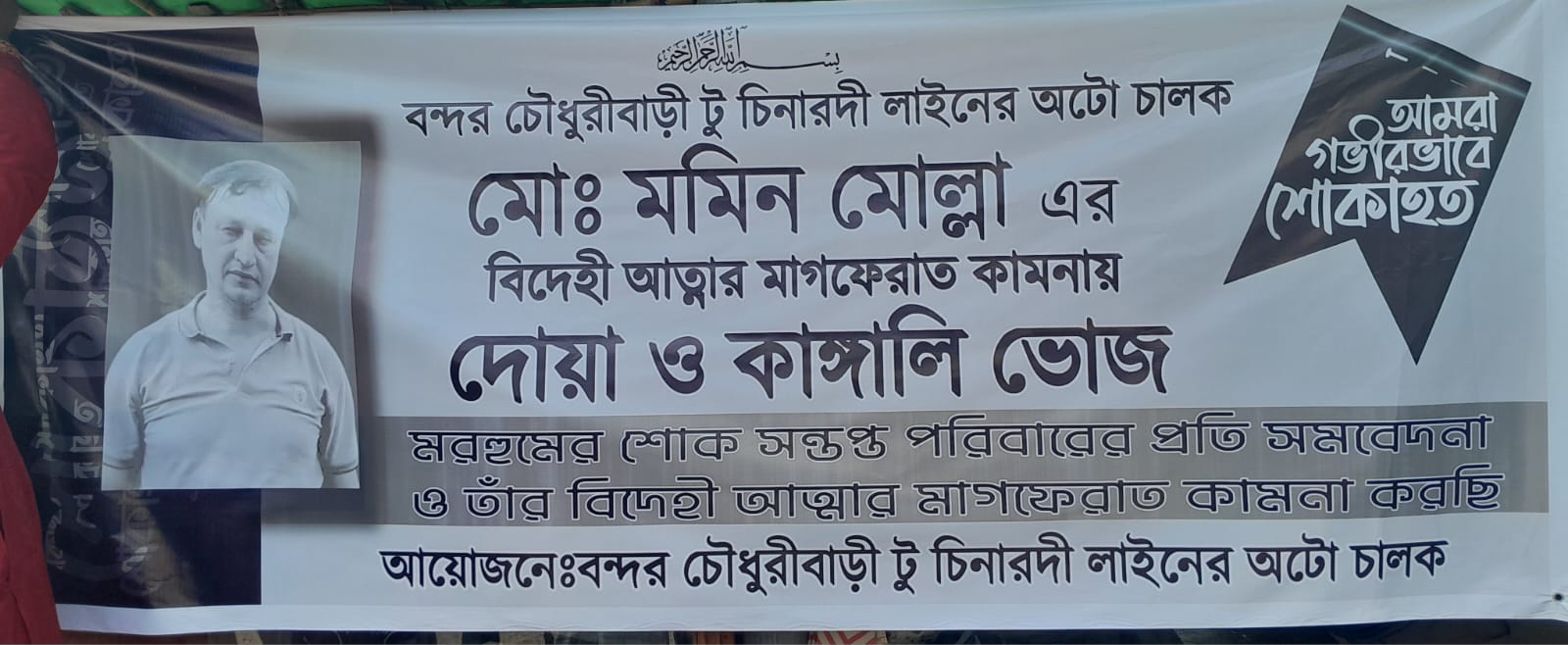 ১৭/৯/২০২৪ ইং রোজ মঙ্গলবার বাদ যোহর নারায়ণগঞ্জ বন্দর অটো স্টানের অটো চালক ও ব্যবসায়িকদের যৌথ উদ্যোগে অটো চালক মরহুম মমিনুল মোল্যার জন্য দোয়াও মিলাদ উপলক্ষে প্রায় ৩ শত লোকের মাঝে নেয়াজ বিতরণ করেন এই নেয়াজের উসিলায় আল্লাহ পাক রাব্বুল আলামিন যেন মরহুম মমিনুল মোল্লা কে ক্ষমা করে দে আমিন আয়োজনে বন্দর ঘাটের সকল অটো চালক ও ব্যবসায়িক নেতৃবৃন্দ উপস্থিত ছিলেন অটো স্টানের অটো চালক দের প্রতিনিধি মোহাম্মদ জাফর মোঃ উজ্জল বন্দর ঘাটের ব্যবসায়িক মোহাম্মদ নাজির হোসেন বন্দর ঘাটের ব্যবসায়ী মোহাম্মদ আমির হোসেন বন্দর ঘাটের ব্যবসায়ীক মোহাম্মদ রহিম বন্দর ঘাটের ব্যবসায়ীক মোহাম্মদ ফরিদ বন্দর ঘাটের ব্যবসায়ীক মোঃ ফিরোজ বন্দর ঘাটের ব্যবসায়ীক মোঃ মুন্না বন্দর ঘাটের ব্যবসায়ীক মোঃ সাদ্দাম