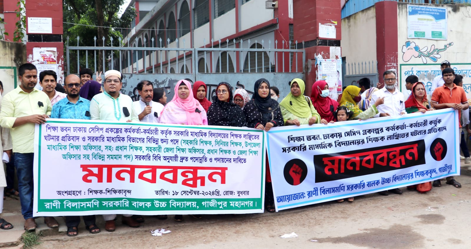অদ্য ১৮/০৯/২০২৪ রোজ বুধবার দুপুর ১২.০৫ মিনিটে গাজীপুর শহরে রাজবাড়ী রোডে রাণী বিলাসমণি সরকারি বালক উচ্চ বিদ্যালয় ও জয়দেবপুর সরকারি বালিকা উচ্চ বিদ্যালয়ের শিক্ষকদের উপস্থিতিতে শিক্ষা ভবন ঢাকায় সেসিপ প্রকল্পের কর্মকর্তা ও কর্মচারী কর্তৃক সরকারি মাধ্যমিক বিদ্যালয়ের শিক্ষক লাঞ্ছিত করার প্রতিবাদে ও সরকারি মাধ্যমিক বিভাগের বিভিন্ন শুন্যপদে ( সহকারি শিক্ষক,সিনিয়র শিক্ষক,উপজেলা মাধ্যমিক শিক্ষা অফিসার,সহকারী প্রধান শিক্ষক,সহকারী জেলা শিক্ষা অফিসার,প্রধান শিক্ষক,জেলা শিক্ষা অফিসার সহ বিভিন্ন সমমান পদে দ্রুত পদোন্নতি /পদায়নের দাবিতে গাজীপুর জেলা প্রশাসক কার্যালয়ের সামনে রাজবাড়ী রোডের পাশে স্কুল গেইটের সামনে এক মানববন্ধন অনুষ্টিত হয়।মানববন্ধনে বক্তারা শিক্ষাভবনে শিক্ষকের উপর হামলাকারীর শাস্তি দাবি করেন যাতে অনুরুপ ঘটনা পুনরাবৃত্তি না ঘটে।