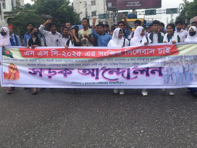চুয়াডাঙ্গা জেলায় এস এস সংক্ষিপ্ত-২০২৫ এর সিলেবাসের দাবিতে চুয়াডাঙ্গা জেলার বিভিন্ন স্কুলের ছাত্র-ছাত্রীদের সড়ক আন্দোলন করেনও বিক্ষোভ মিছিল বের করেন জেলার ছাত্র-ছাত্রীরা।