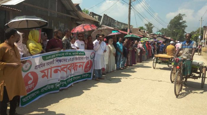 টাঙ্গাইলের সখিপুরে ১৪৭টি সরকারি প্রাথমিক বিদ্যালয়ের শিক্ষকগন প্রধান শিক্ষকদের ৯ম গ্রেড,সহকারি শিক্ষকদের ১০ম গ্রেড বাস্তবায়নের দাবিতে শুক্রবার(২০সেপ্টেম্বর) বেলা ১১টার সময় সখিপুর উপজেলা গেইটের সামনে মানববন্ধন করেছেন। উক্ত মানববন্ধনে বাংলাদেশ প্রাথমিক