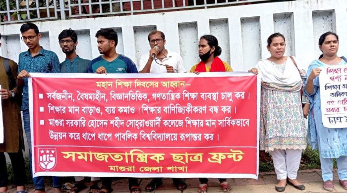মাগুরায় ১৭ সেপ্টেম্বর মহান শিক্ষা দিবস উপলক্ষে সর্বজনীন, বৈষম্যহীন, বিজ্ঞানভিত্তিক, গণতান্ত্রিক শিক্ষা ব্যবস্থা চালু করা, শিক্ষার মান বাড়ানো, ব্যয় কমানো, শিক্ষার বাণিজ্যিকীকরণ বন্ধ করাসহ বিভিন্ন দাবিতে সমাজতান্ত্রিক ছাত্র ফ্রন্ট মাগুরা
