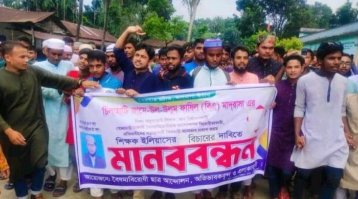 সোহেল রানা,ডোমারঃ নীলফামারীর ডোমার উপজেলার চিলাহাটি জামেউল-উলুম ফাজিল (বিএ) মাদ্রাসার শিক্ষার্থীদের ৮ দফা দাবি প্রদানের ঘটনায় শিক্ষার্থীদের উপর শিক্ষক কর্তৃক দমন নীতির প্রতিবাদে মানববন্ধন অনুষ্ঠিত হয়েছে। রবিবার (৮ই সেপ্টেম্বর) সকালে