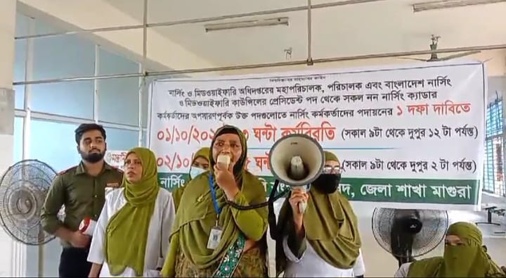 এক দফা দাবিতে মঙ্গলবার সকাল ৯ টা থেকে দুপুর ১২ টা পর্যন্ত তিন ঘন্টা কর্মবিরতি পালন করেছে মাগুরা জেলা শাখার নার্সিং ও মিডওয়াইফারি সংস্কার পরিষদ।