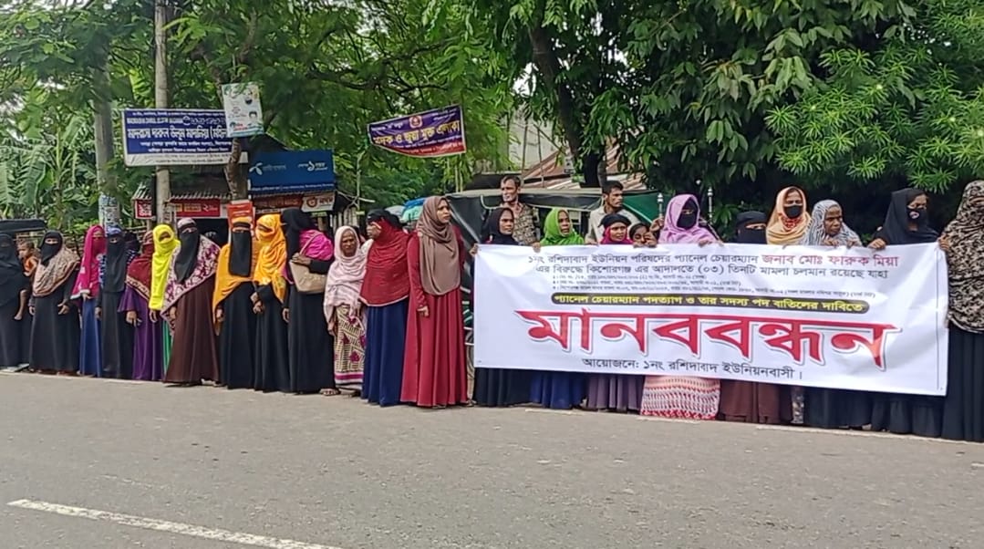 ১নং রশিদাবাদ ইউনিয়ন পরিষদের নব নির্বাচিত প্যানেল চেয়ারম্যান ফারুক মিয়াকে প্যানেল চেয়ারম্যানের পদ থেকে বহিষ্কারের দাবিতে মানববন্ধন করেছে স্থানীয় এলাকাবাসী।