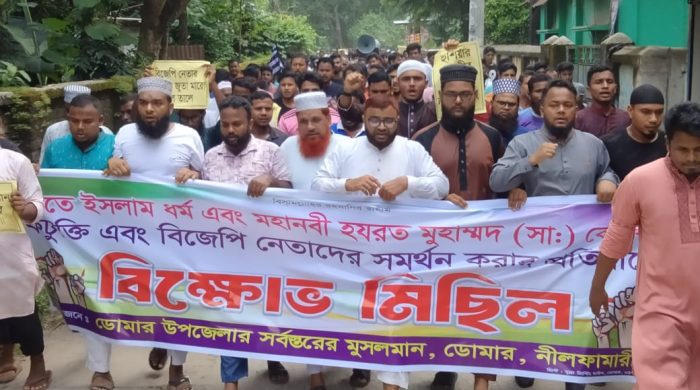 সোহেল রানা,ডোমারঃ মহানবী হযরত মুহাম্মদকে (সা.) নিয়ে ভারতীয় পুরোহিতের কটূক্তি এবং সেই বক্তব্যকে বিজেপির এক নেতার সমর্থন দেওয়ার প্রতিবাদে বিক্ষোভ মিছিল করেছেন নীলফামারীর ডোমার উপজেলার সর্বস্তরের মসলিম জনগন ও সাধারণ