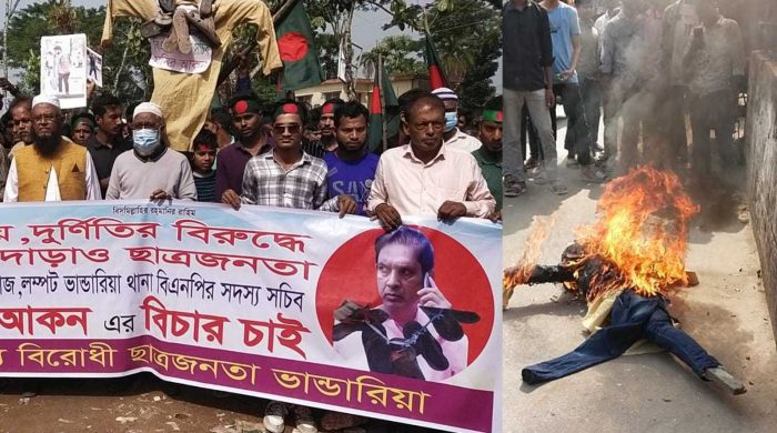 পিরোজপুরের ভান্ডারিয়ায় উপজেলা বিএনপির সদস্য সচিব মনির আকনের বিরুদ্ধে বিভিন্ন অনিয়মের অভিযোগ এনে বৈষম্য বিরোধী ছাত্রজনতার ব্যানারে এক বিক্ষোভ মিছিল বের করা হয়। এসময় তার কুশপুতুল দাহ করা হয়।