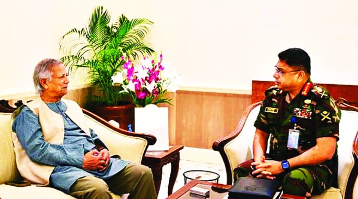 অন্তর্বর্তী সরকারের প্রধান উপদেষ্টা অধ্যাপক ড. মুহাম্মদ ইউনূসের সঙ্গে সেনাবাহিনীর প্রধান জেনারেল ওয়াকার–উজ–জামান সৌজন্য সাক্ষাৎ করেছেন। গতকাল রোববার ঢাকায় তেজগাঁও প্রধান উপদেষ্টার কার্যালয়ে এ সাক্ষাৎ অনুষ্ঠিত হয়। খবর বাসসের। সাক্ষাৎকালে সেনাবাহিনী