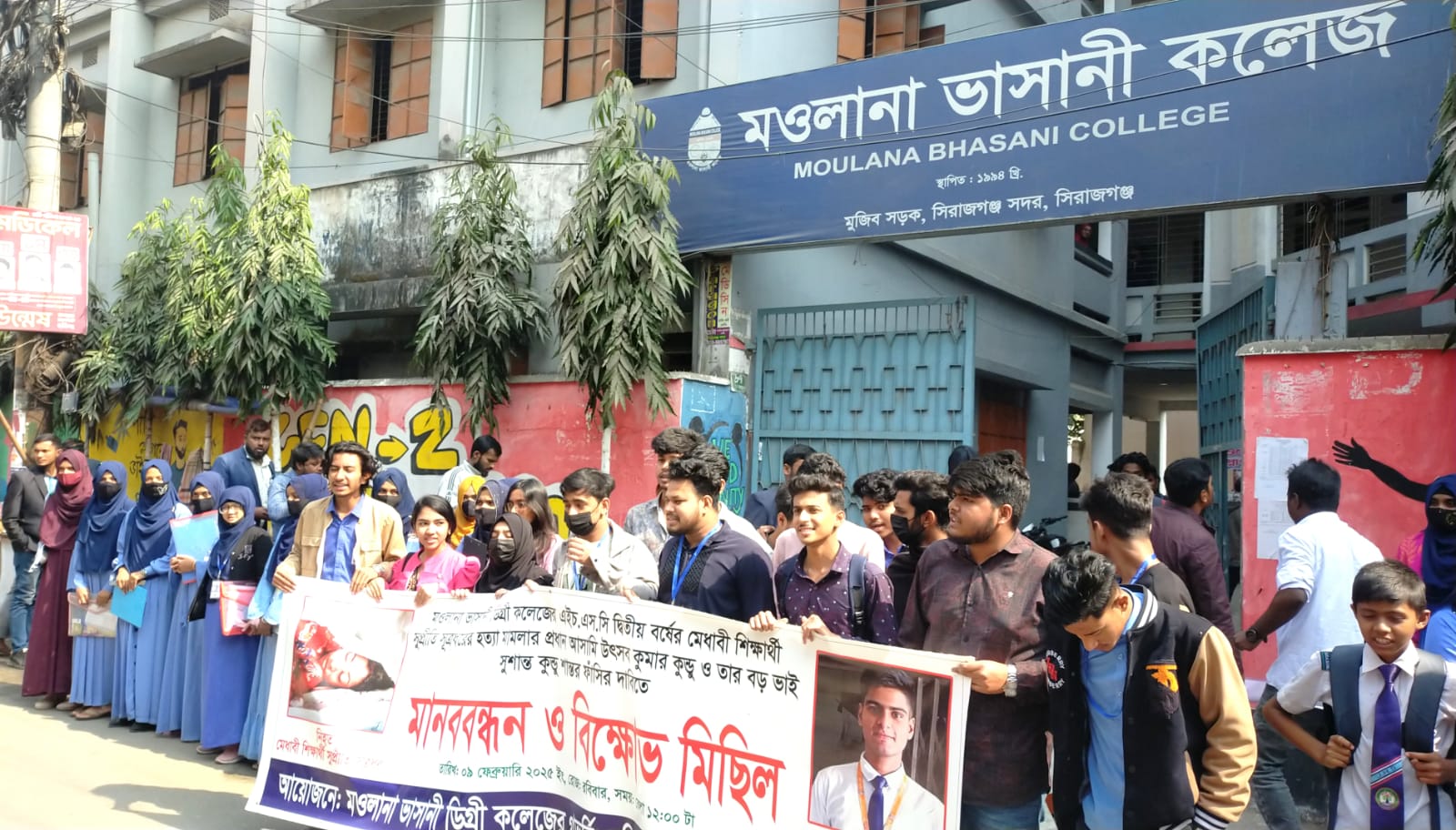 সিরাজগঞ্জ মাওলানা ভাসানী ডিগ্রী কলেজের এইচ.এস.সি দ্বিতীয় বর্ষের মেধাবী শিক্ষার্থী সুপ্রীতি সূত্রধরের হত্যা মামলার প্রধান আসামি উৎসব কুমার কুন্ডু ও তার বড় ভাই সুশান্ত কুন্ডু শান্তর ফাঁসির দাবিতে মানববন্ধন করেছে অত্র কলেজের শিক্ষার্থীরা।
