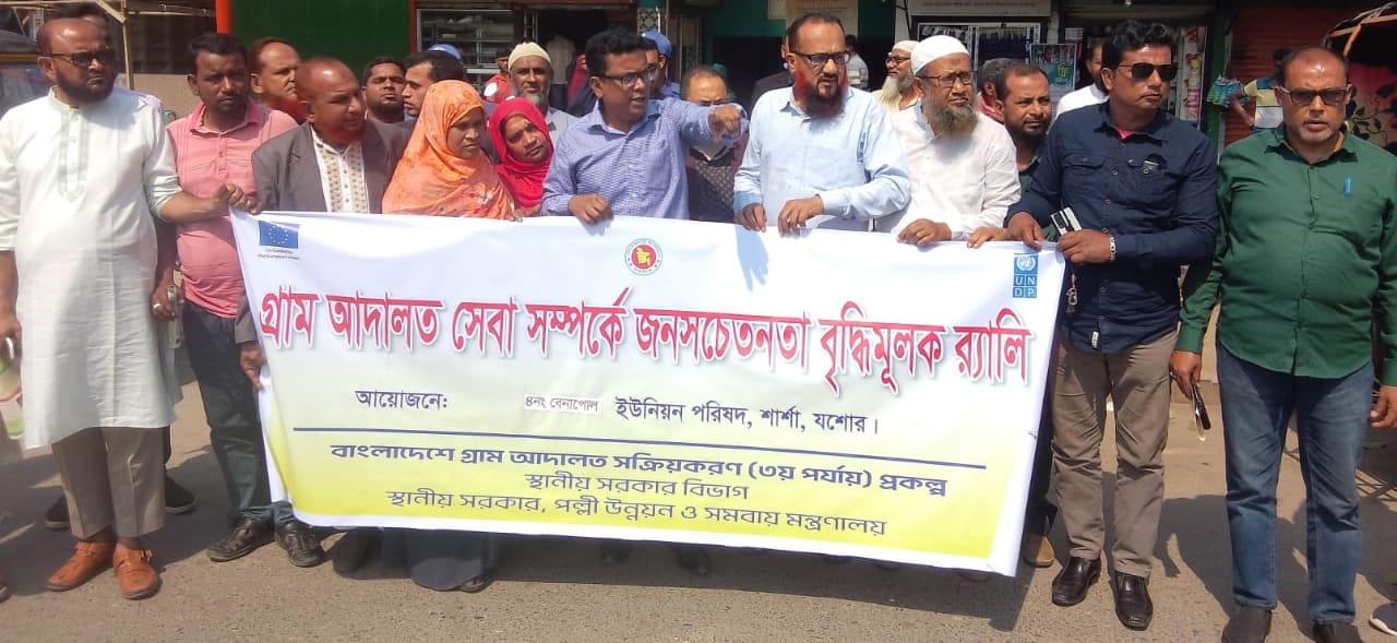 যশোরের বেনাপোল,বন্দর নগরীর বেনাপোলে ৪ নম্বর বেনাপোল ইউনিয়ন কর্তৃক আয়োজিত বাংলাদেশ স্থানীয় সরকার ও পল্লী উন্নয়ন সমবায় এর উদ্যোগে( ১৬/০২/২০২৫) রবিবার সকাল ১০ ঘটিকার সময় বেনাপোল ইউনিয়ন পরিষদের হল রুমে বেনাপোল ইউনিয়নের বিভিন্ন ওয়ার্ডে স্থানীয় নেতৃবৃন্দের উপস্থিতিতে গ্রাম আদালত বিষয়ক কমিউনিটি মত বিনিময় সভা এবং ভিডিও প্রদর্শনী অনুষ্ঠিত হয় ।