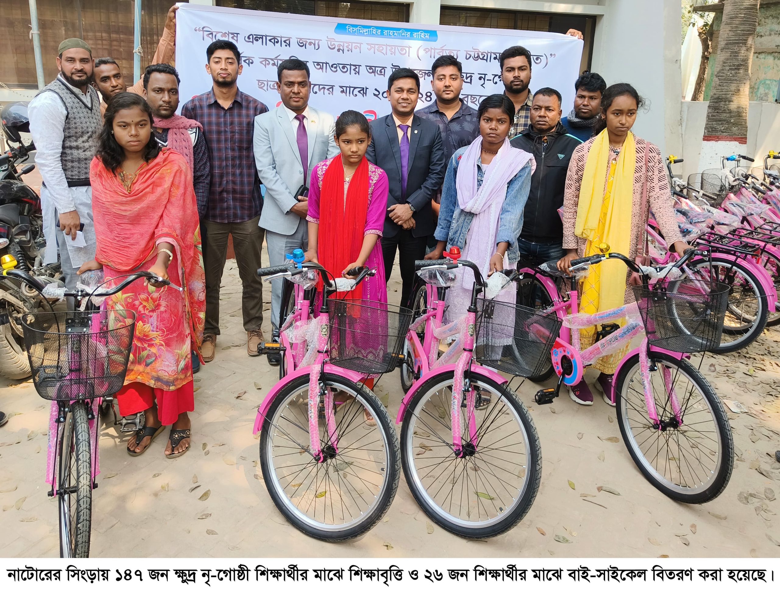 নাটোরের সিংড়ায় ১৪৭ জন ক্ষুদ্র নৃ-গোষ্ঠী শিক্ষার্থীর মাঝে ৫ লাখ ৮৪ হাজার ৫০০ টাকা শিক্ষাবৃত্তি ও ২৬ জন শিক্ষার্থীর মাঝে বাই-সাইকেল বিতরণ করা হয়েছে।