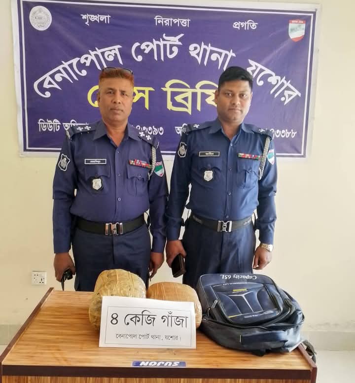 পৃথক অভিযানে বেনাপোল পোর্ট থানার এসআই (নিঃ)/মোঃ মোস্তাফিজুর রহমান গোপন সংবাদের ভিওিতে সঙ্গীয় অফিসার ও ফোর্সের সহায়তায় ইং ১০/০৩/২০২৫ তারিখ ০৮:৩০ ঘটিকা সময় বেনাপোল পোর্ট থানাধীন বড় আচঁড়া গ্রামস্থ স্থলবন্দর আর্ন্তজাতিক বাস টার্মিনালের অভিযান পরিচালনা করাকালীন টামিনালে পুলিশের উপস্হিতি টের পেয়ে টামিনালে অবস্থানরত বিআরটিসি বাস ঢাকা মেট্রা-ব-১৫-৬০১৫ গাড়ী হতে অজ্ঞাতনামা ২/৩ জন আসামী কৌশলে পালিয়ে যায় এবং অভিযানের একপযায়ে উক্ত বাসের বাংকারে তল্লাশী করে একটি নেভিব্লু রংয়ের কাধে ঝুলানো স্কুল ব্যাগের মধ্যে খাকি রংয়ের স্কচ টেপ দ্বারা মোড়ানো ০২ (দুই) প্যাকেটে সর্বমোট ০৪ (চার) কেজি অবৈধ মাদকদ্রব্য গাঁজা উদ্ধার করে থানায় হাজির হয়ে এজাহার দায়ের করেন।