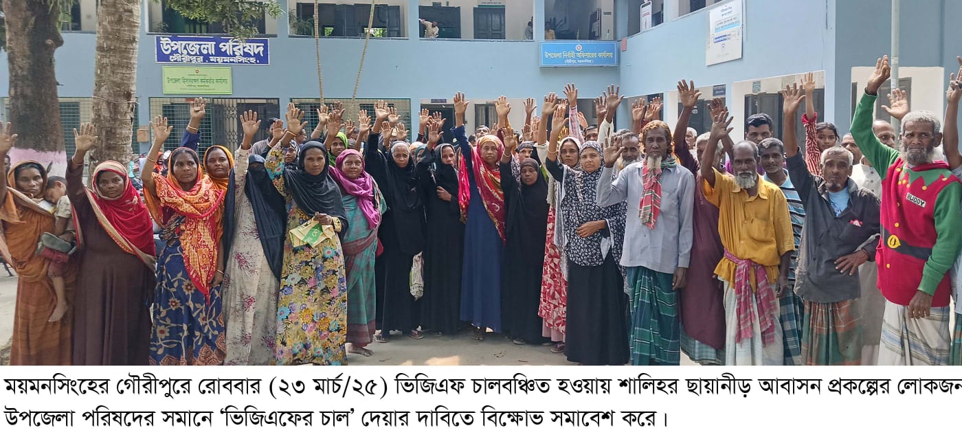 এদিকে ২নং গৌরীপুর ইউনিয়নে শনিবার (২২ মার্চ/২৫) চাল বিতরণ করা হয়। তবে এ ইউনিয়নের নিজেদের ঘরবাড়িহীন অসহায় হয়ে আশ্রয় নেয়া শালীহর ছায়ানীড় আবাসন প্রকল্পের বাসিন্দা চাল পায়নি। এতে তারা বিক্ষুব্দ হয়ে রোববার শহরে ও উপজেলা পরিষদের সামনে বিক্ষোভ মিছিল এবং ২নং গৌরীপুর ইউনিয়ন পরিষদ ঘেরাও কর্মসূচি পালন করে। এ প্রসঙ্গে সমিতির সভাপতি মো. জমশেদ আলী জানায়, এ আবাসন প্রকল্পটি ২নং গৌরীপুর ইউনিয়ন পরিষদে ১নং ও ২নং ওয়ার্ডে অবস্থিত। উপজেলার বিভিন্ন এলাকায় ঘরবাড়ি-ভিটেমাটিহীন অসহায় পরিবারগুলো আশ্রয় নিয়েছে। ওরা নি:স্ব। ২/৩দিন ধরে ঈদের চালের জন্য যোগাযোগ করেছি। চাল না দেয়ায় আবাসনের বাসিন্দারা বিক্ষুব্দ হয়ে পড়েছেন। আবাসন প্রকল্পের সাধারণ সম্পাদক মো. সেলিম মিয়া জানান, এখানে যারা বাস করে তারা অতিদরিদ্র শুধু নয়, ছিন্নমূল-দরিদ্র। ওরা চাল পাবে না, তাহলে চাল পাবে কারা? সমাবেশ বক্তব্য রাখেন আবাসনের বাসিন্দা আব্দুল সালাম, মতিউর রহমান, পারভীন আক্তার, শহিদুল ইসলাম, লাইলী আক্তার, সুফিয়া আক্তার, রহিমা আক্তার, ফিরুজা বেগম, শামসুন নাহার, সুরুজ আলী প্রমুখ। তাদের বলেন, যতক্ষন পর্যন্ত চাল না পাবো, ততক্ষন পর্যন্ত এ ইউনিয়ন পরিষদের সামনে থেকে আমরা যাবো না।