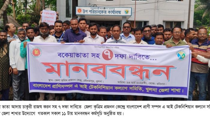বকেয়া ভাতা আদায় চাকুরী রাজস্ব করন সহ ৭ দফা দাবিতে খুলনার দিঘলিয়া উপজেলার আড়ংঘাটাস্থ জেলা কৃত্রিম প্রজনন কেন্দ্রে বাংলাদেশ প্রাণী সম্পদ এ আই টেকনিশিয়ান কল্যান সমিতি , খুলনা জেলা শাখার