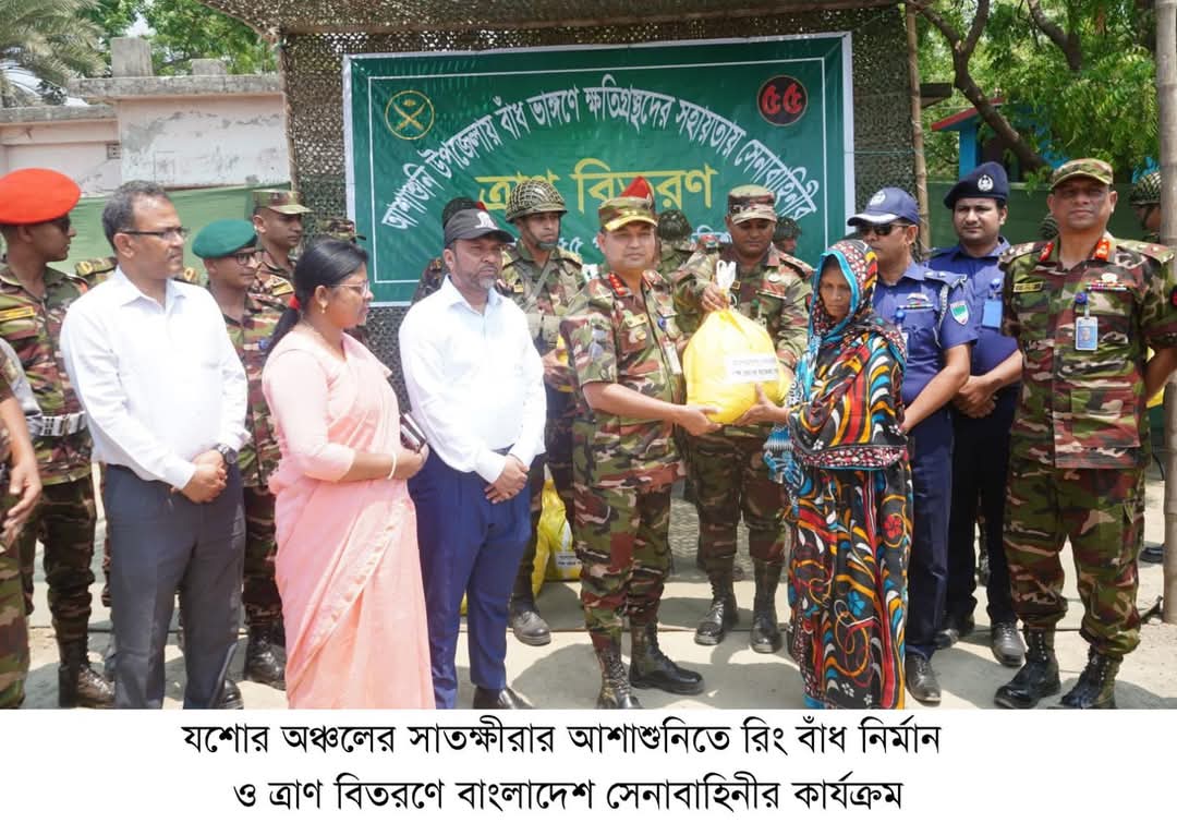 ঢাকা, ০৮ এপ্রিল ২০২৫ (মঙ্গলবার): সাতক্ষীরা জেলার আশাশুনি উপজেলার আনুলিয়া ইউনিয়নের বিছট গ্রামে রিং বাঁধ নির্মাণে বাংলাদেশ সেনাবাহিনীর ৫৫ পদাতিক ডিভিশনের সেনাসদস্যগণ পানি উন্নয়ন বোর্ডের সঙ্গে সমন্বয় করে নিরলসভাবে কাজ করে যাচ্ছেন। এরই ধারাবাহিকতায়, জিওসি ৫৫ পদাতিক ডিভিশন ও এরিয়া কমান্ডার, যশোর এরিয়া মেজর জেনারেল জে এম ইমদাদুল ইসলাম, এনডিসি, এএফডব্লিউসি, পিএসসি, এমফিল ক্ষতিগ্রস্ত এলাকা পরিদর্শন করেন। পরবর্তীতে, তিনি সেনাবাহিনীর পক্ষ হতে যোগাযোগ বিচ্ছিন্ন দুর্গম ও প্রত্যন্ত অঞ্চলের পানি বন্দী মানুষের মাঝে ত্রাণ বিতরণ করেন এবং এই দুর্যোগে ক্ষতিগ্রস্তদের পাশে থাকার অঙ্গীকার ব্যক্ত করেন। এ সময় কমান্ডার ১০৫ পদাতিক বিগ্রেড, জেলা প্রশাসক ও পুলিশ সুপার সাতক্ষীরা জেলা এবং পানি উন্নয়ন বোর্ডের কর্মকর্তাবৃন্দ উপস্থিত ছিলেন।