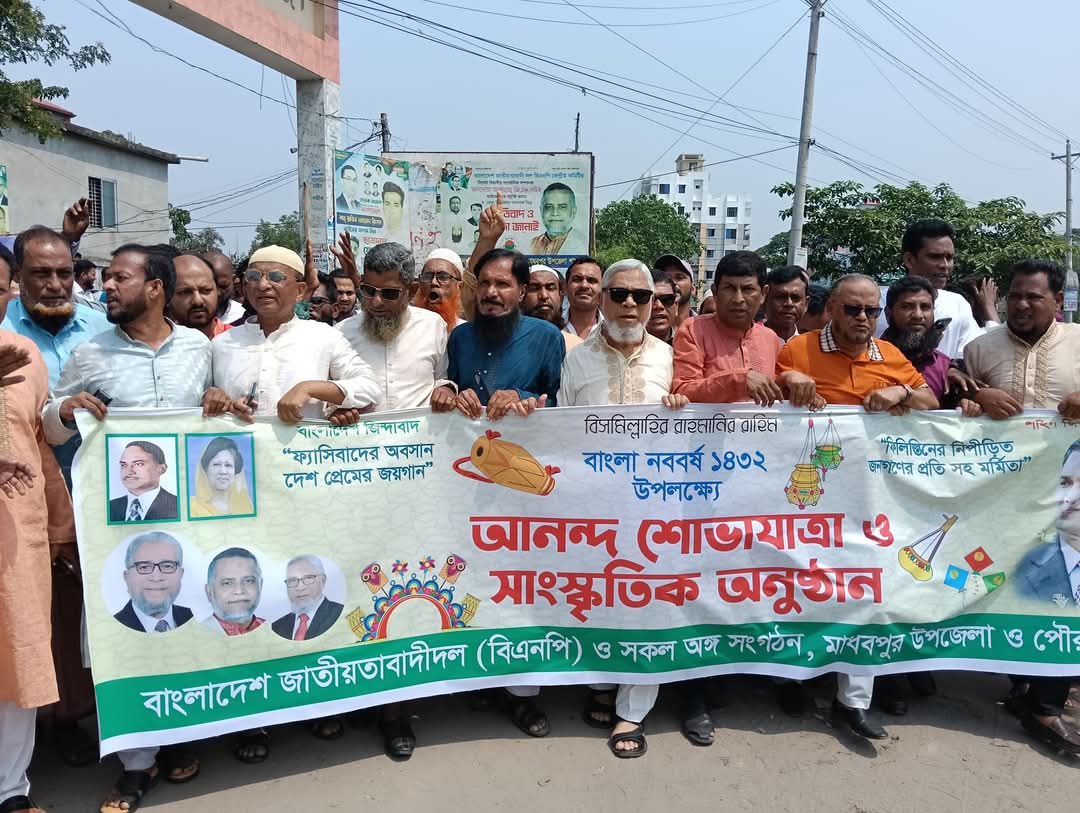 হবিগঞ্জের মাধবপুরে মাধবপুর উপজেলা ও পৌর বিএনপির উদ্যোগে নববর্ষ উপলক্ষে আনন্দ শোভাযাত্রা অনুষ্ঠিত হয়েছে। সাবেক উপজেলা চেয়ারম্যান ও জেলা সহ-সভাপতি সৈয়দ মোঃ শাহ জাহানের নেতৃত্বে সোমবার সকালে শোভাযাত্রা অনুষ্ঠিত হয়। মাধবপুর উপজেলা চত্বর থেকে শুরু হয়ে শোভাযাত্রাটি মাধবপুর বাজারের অলিগলি প্রদক্ষিণ করে। এতে আরো উপস্থিত ছিলেন উপজেলা বিএনপির সভাপতি সামসুল ইসলাম কামাল, যুগ্ম সাধারণ সম্পাদক সুমন চৌধুরী, সাংগঠনিক সম্পাদক ও চেয়ারম্যান মাহবুর রহমান সোহাগ, পৌর বিএনপির সভাপতি গোলাপ খান, সাধারণ সম্পাদক আলাউদ্দিন আল-রনি, সাবেক ভাইস চেয়ারম্যান আব্দুল আজিজ, সাবেক মেয়র হাবিবুর রহমান মানিক, উপজেলা যুবদলের আহবায়ক এনায়েত উল্লাহ, সিনিয়র যুগ্ম আহবায়ক কবির চৌধুরী, উপজেলা ছাত্রদলের আহবায়ক মারুফ মিয়া, উপজেলা স্বেচ্ছাসেবক দলের সিনিয়র আহবায়ক ফরিদুর রহমান, পৌর যুবদলের আহবায়ক জনি পাঠান, সিনিয়র যুগ্ম সম্পাদক শামছুল ইসলাম মামুন, যুগ্ম সম্পাদক সুমন চৌধুরী, যুগ্ম আহবায়ক শফিক মিয়া, জসিম শিকদার, পৌর স্বেচ্ছাসেবক দলের আহবায়ক আলমগীর কবির, সিনিয়র যুগ্ম আহবায়ক রাসেল আহমেদ, পৌর ছাত্রদলের আহবায়ক রিপন মিয়া, সিনিয়র যুগ্ম আহবায়ক রাজ, যুগ্ম আহবায়ক জুলহাস উদ্দিন রিংকু প্রমুখ।