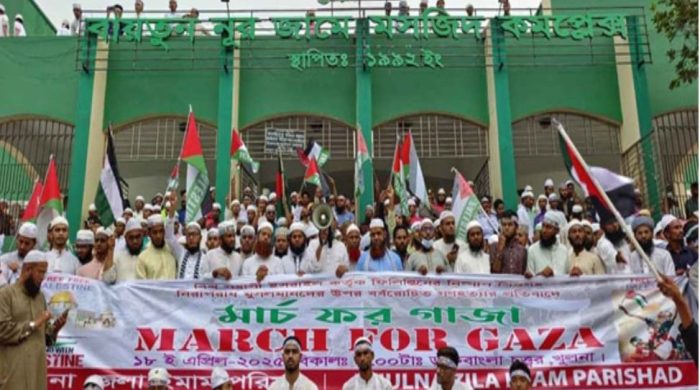 বিশ্ব সন্ত্রাসী ইজরাইল কর্তৃক ফিলিস্তিনের নিষ্পাপ শিশুসহ নিরপরাধ মুসলমানদের ওপর বর্বরোচিত গণহত্যার প্রতিবাদে ইমাম পরিষদ খুলনা জেলা শাখার উদ্যোগে ‘মার্চ ফর গাজা’ বিক্ষোভ মিছিল ও প্রতিবাদ সভা অনুষ্ঠিত হয়েছে। শুক্রবার