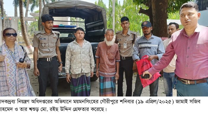 মাদকদ্রব্য নিয়ন্ত্রণ অধিদপ্তরের অভিযানে ময়মনসিংহের গৌরীপুরে শনিবার (১৯ এপ্রিল/২০২৫) জামাই-শ্বশুড়কে গ্রেফতার করেছে। গ্রেফতারকৃতরা হলেন, সজিব আহমেদ ও তার শ্বশুড় মো. রইছ উদ্দিন। তাদের নিকট থেকে ১হাজার ৮শ পিচ ইয়াবা ট্যাবলেট read more