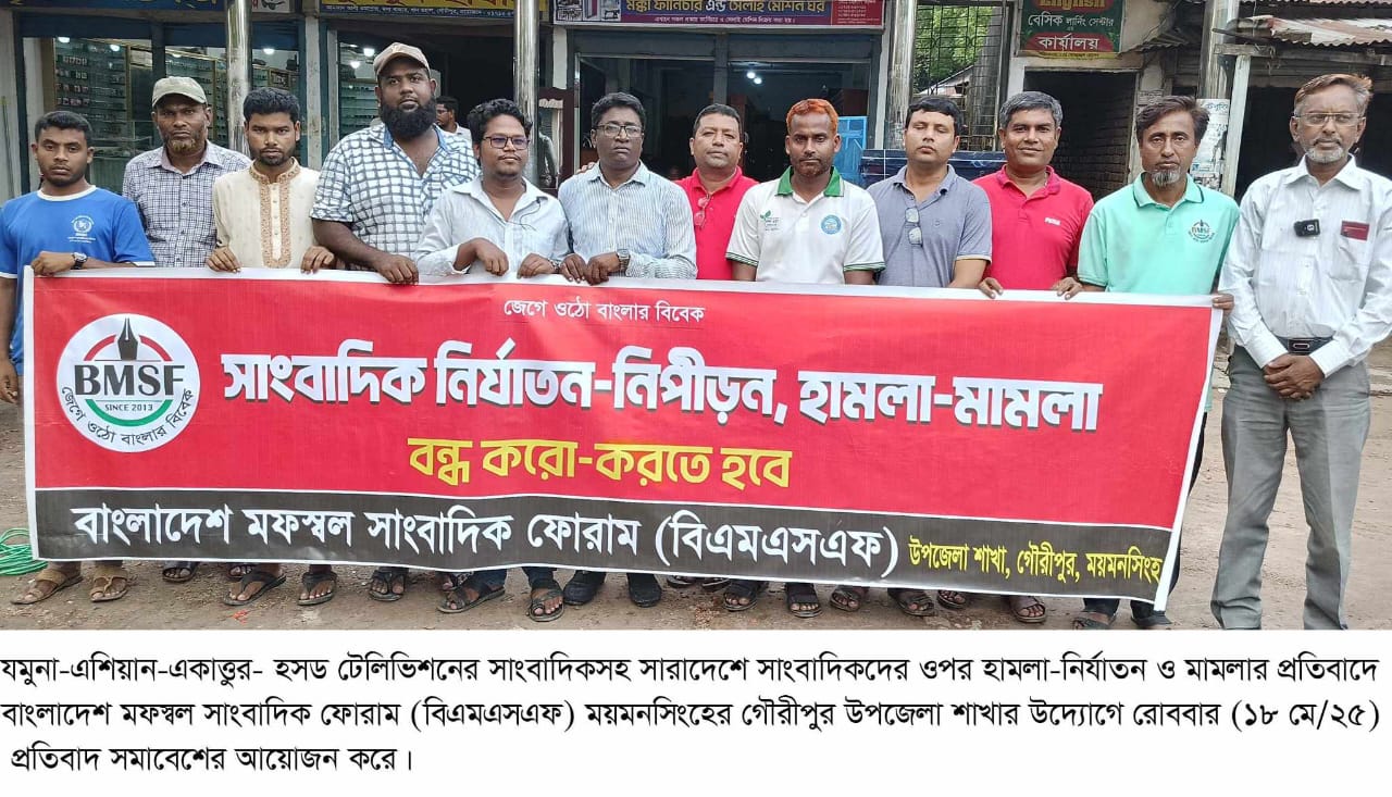 গাজীপুরের কাপাসিয়া যমুনা টেলিভিশন, ঢাকায় এশিয়ান টেলিভিশন, সাভারে একাত্তুর টেলিভিশনের সাংবাদিকসহ সারাদেশের সাংবাদিকদের ওপর হামলা-নির্যাতন ও মামলার প্রতিবাদে বাংলাদেশ মফস্বল সাংবাদিক ফোরাম (বিএমএসএফ) ময়মনসিংহের গৌরীপুর উপজেলা শাখার উদ্যোগে রোববার