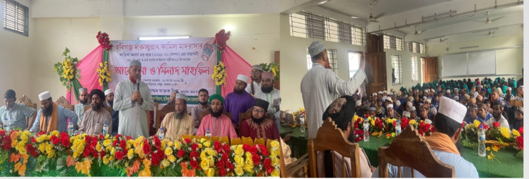 হবিগঞ্জ জেলার সর্ববৃহৎ আলিয়া মাদরাসা, সদরে অবস্থিত হবিগঞ্জ দারুচ্ছুন্নাৎ কামিল মাদরাসার ফাজিল অনার্স ৩য় ব্যাচ সমাপনী ও ১ম, ২য়, ৩য় এবং ৪র্থ বর্ষের ফাইনাল পরীক্ষা উপলক্ষে গতকাল ২২শে মে ২০২৫ বৃহস্পতিবার সকাল ১০ঃ৩০টায় মাদরাসা হলরুমে অধ্যক্ষ মুফতি মুহাম্মদ ফারুক মিয়ার সভাপতিত্বে আলোচনা ও মিলাদ মাহফিল অনুষ্ঠিত হয়। এতে প্রধান অতিথি হিসেবে উপস্থিত ছিলেন ইসলামিক ফাউন্ডেশন হবিগঞ্জ জেলার সম্মানিত উপপরিচালক মুহাম্মদ মুনিরুজ্জামান, বিশেষ অতিথি হিসেবে জেলার স্বনামধন্য শিক্ষাপ্রতিষ্ঠান সমূহের প্রতিনিধিসহ অত্র মাদরাসার সাবেক ও বর্তমান সম্মানীয় শিক্ষক-শিক্ষিকা ও সম্মানিত অভিভাবকবৃন্দ বক্তব্য রাখেন।আল-হাদিস এন্ড ইসলামিক স্টাডিজ বিভাগীয় প্রধান মুফতি হাফিজ আহমদ নিজামী শাফির সঞ্চালনায় সম্মানীয় অতিথিবৃন্দের পাশাপাশি শিক্ষার্থীদের মধ্য থেকে বাংলা, আরবি ও ইংরেজি ভাষায় বক্তব্য রাখেন মাদরাসার মাস্টার্স পরীক্ষার্থী মুহাম্মদ ইমরান হোসাইন, অনার্স ৪র্থ বর্ষের মুহাম্মদ শাকিল মিয়া, মুহাম্মদ মুনির হোসাইন, কামিলের মুহাম্মদ আব্দুল মুসাব্বির মাসুমসহ অনেকেই।