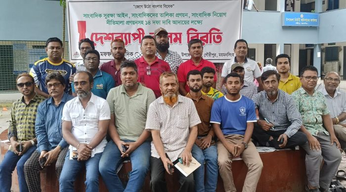 সাংবাদিক সুরক্ষা আইন, সাংবাদিকদের তালিকা প্রণয়ন, চাকুরিবিধি ও নীতিমালা প্রণয়ন, চাকুরি নিশ্চয়তা-বেতন-ভাতাপ্রদানসহ ১৪দফা বাস্তবায়নের দাবিতে বাংলাদেশ মফস্বল সাংবাদিক ফোরাম (বিএমএসএফ) ময়মনসিংহের গৌরীপুর উপজেলা শাখার উদ্যোগে মঙ্গলবার (২০ মে/২৫) উপজেলা পরিষদ