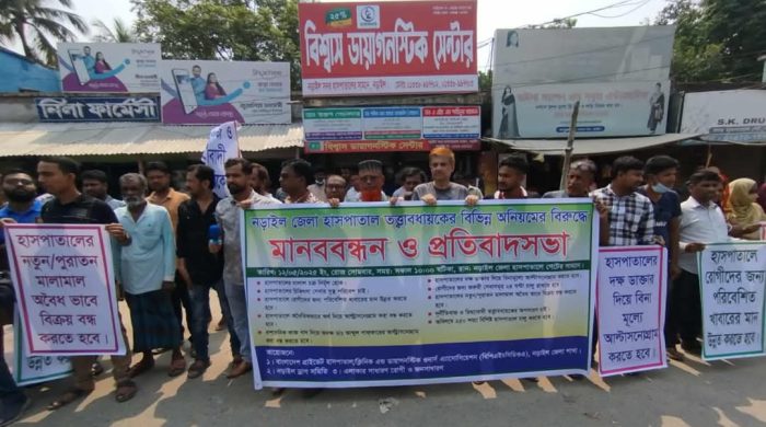 নড়াইল জেলা হাসপাতালের তত্ত্বাবধায়ক ডা. আব্দুল গফফারের বিরুদ্ধে নানা অনিয়ম, দুর্নীতি ও স্বেচ্ছাচারিতার অভিযোগ এনে তাঁর অপসারণের দাবিতে মানববন্ধন ও প্রতিবাদ সভা অনুষ্ঠিত হয়েছে। সোমবার (১২মে)সকাল ১০টায় জেলা হাসপাতালের সামনে