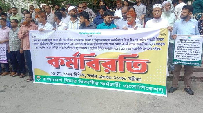 বিচার বিভাগের সহায়ক কর্মচারীদের দাবি আদায়ে ঝিনাইদহে দুই ঘণ্টার শান্তিপূর্ণ কর্মবিরতি পালন করেছে বাংলাদেশ বিচার বিভাগীয় কর্মচারি অ্যাসোসিয়েশন জেলা শাখা। সোমবার (৫ মে) সকাল সাড়ে ৯টা থেকে বেলা সাড়ে ১১টা