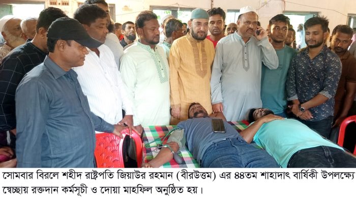 মহান স্বাধীনতার ঘোষক, বহুদলীয় গণতন্ত্রের প্রবক্তা বাংলাদেশ জাতীয়তাবাদী দল-বিএনপি’র প্রতিষ্ঠাতা শহীদ রাষ্ট্রপতি জিয়াউর রহমান (বীরউত্তম) এর ৪৪তম শাহাদাৎ বার্ষিকী উপলক্ষ্যে তৈয়বা মজুমদার রেড ক্রিসেন্ট রক্ত কেন্দ্র এর আয়োজনে স্বেচ্ছায় রক্তদান