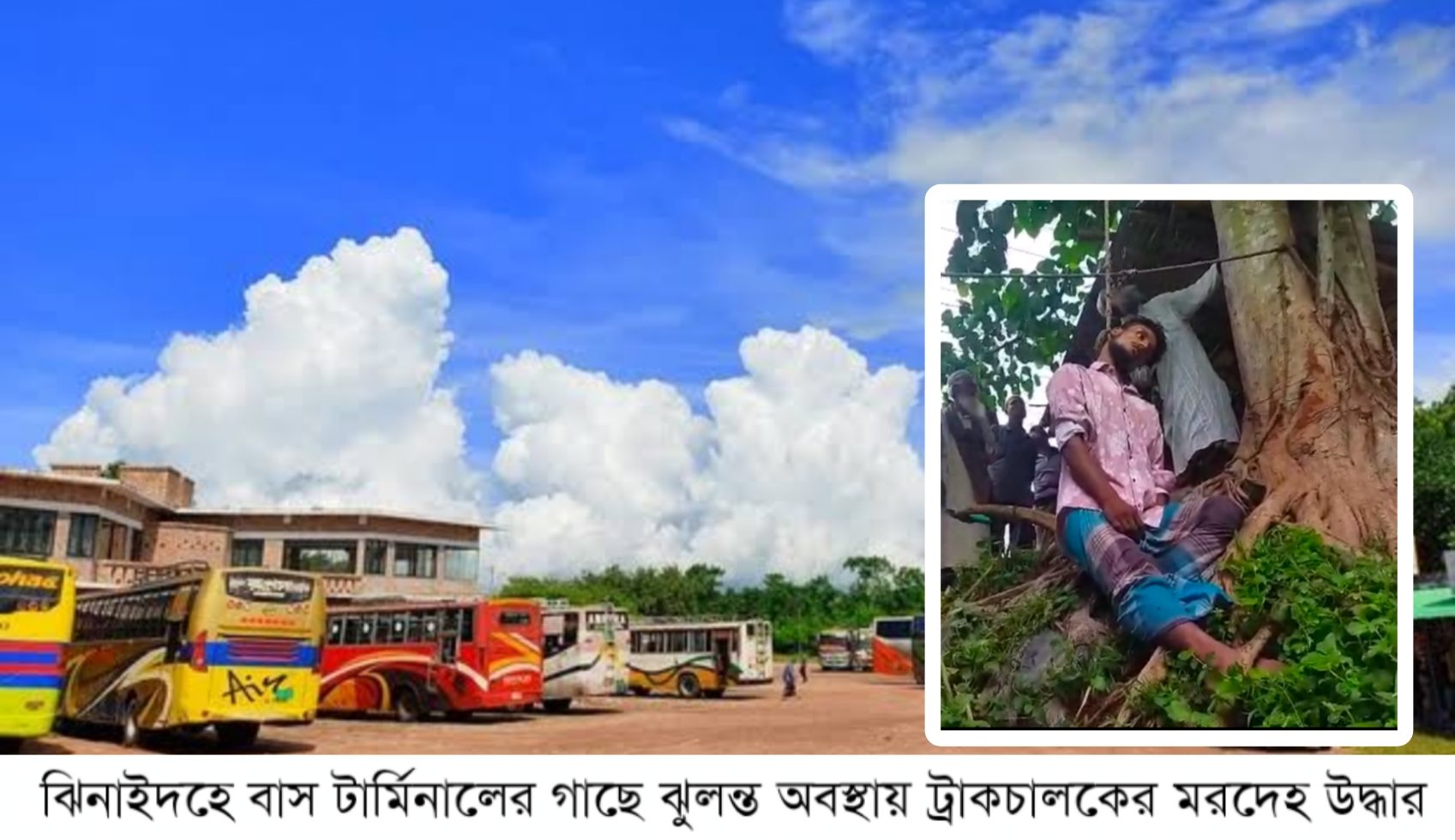 ঝিনাইদহ শহরের কেন্দ্রীয় বাস টার্মিনাল এলাকায় গাছের সঙ্গে ঝুলন্ত অবস্থায় মধু হোসেন (২৮) নামের এক ট্রাকচালকের মরদেহ উদ্ধার করেছে পুলিশ। মঙ্গলবার সকালে পুকুরপাড়ের একটি গাছ থেকে তার মরদেহ উদ্ধার করা হয়। নিহত মধু সদর উপজেলার পোড়াহাটি ইউনিয়নের হীরাডাঙ্গা গ্রামের বাসিন্দা এবং পেশায় একজন ট্রাকচালক। তার পিতার নাম বিল্লাল হোসেন।