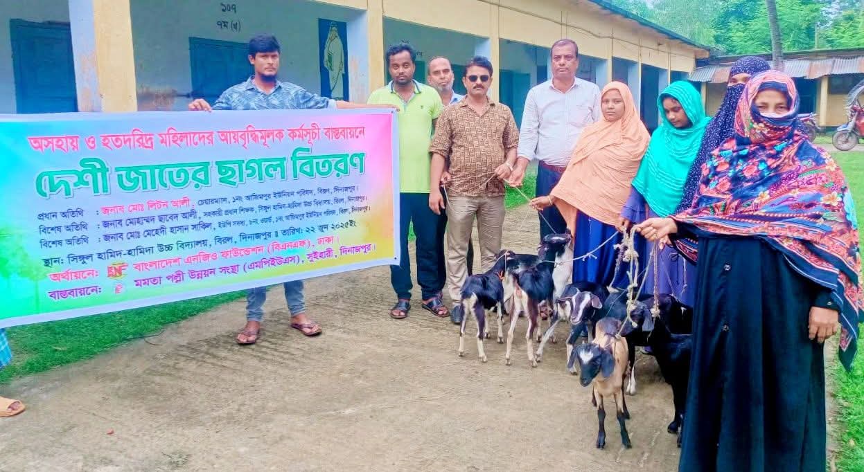 বিরলে মমতা পল্লী উন্নয়ন সংস্থা'র উদ্যোগে এবং বাংলাদেশ এনজিও ফাউন্ডেশন এর অর্থায়নে অসহায় ও দরিদ্র মহিলাদের আয়বৃদ্ধিমূলক কমসূচির অধীনে ছাগল বিতরণ করা হয়েছে।