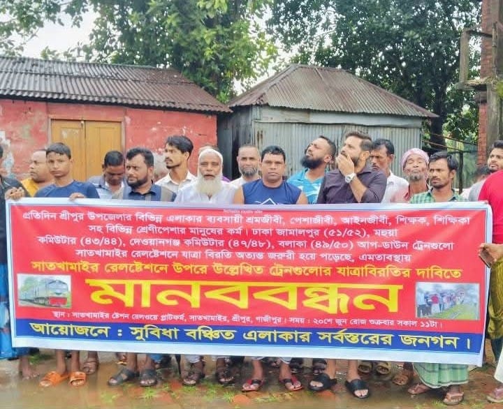 গাজীপুরের শ্রীপুরে দীর্ঘদিন ধরে বন্ধ থাকা সাতখামাইর রেলস্টেশনটি পুনরায় চালুর দাবিতে মানববন্ধন করেছেন রেল সুবিধা বঞ্চিত এলাকাবাসী। আজ সকাল ১০টায় সাতখামাইর রেলওয়ে স্টেশনের প্ল্যাটফর্মে আয়োজিত এই মানববন্ধনে প্রায় সাত থেকে আট শতাধিক ভুক্তভোগী মানুষ অংশগ্রহণ করেন।