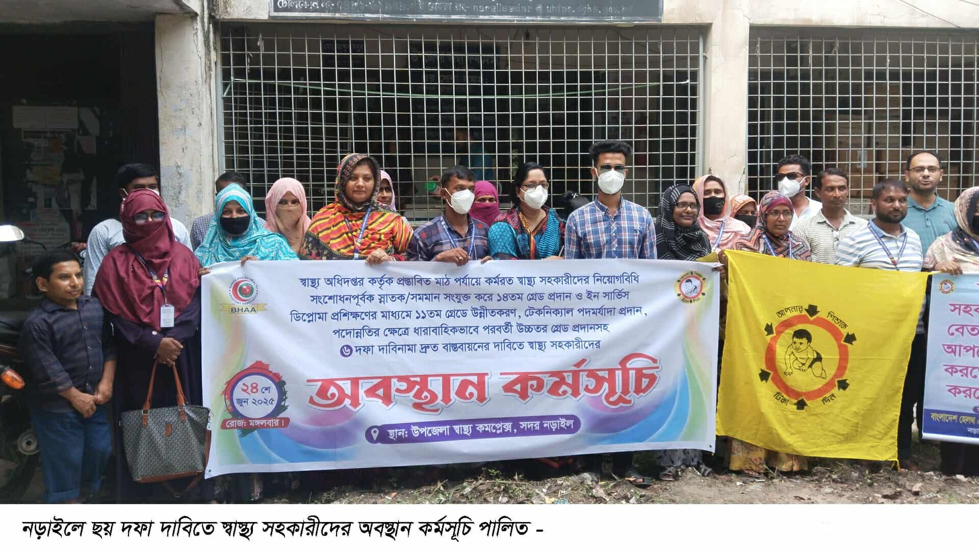 নড়াইলে চাকরিতে ১৪তম গ্রেড ও ‘টেকনিক্যাল পদমর্যাদা’ দেয়াসহ ৬দফা দাবিতে অবস্থান কর্মসূচি পালন করেছেন স্বাস্থ্য সহকারীরা। মঙ্গলবার সকাল ১০টায় বাংলাদেশ স্বাস্থ্য সহকারী অ্যাসোশিয়েশন নড়াইল সদর উপজেলা শাখার আয়োজনে নড়াইল সদর উপজেলা স্বাস্থ্য ও পরিবার পরিকল্পনা অফিসের সামনে এ কর্মসূচি পালিত হয়।