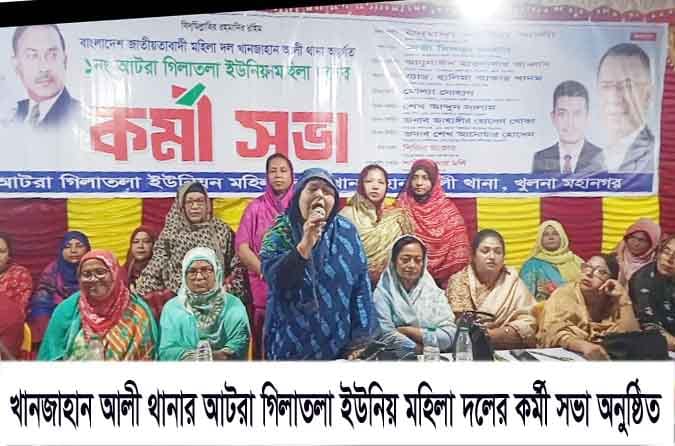 খুলনা মহানগর খান জাহান আলী থানার ১ নং আটরা গিলাতলা ইউনিয়ন মহিলা দলের কর্মীসভা আফিলগেট সোমবার বিকাল সাড়ে ৪ টায় অনুষ্ঠিত হয়। খান জাহান আলী থানা মহিলা দলের আহ্বায়ক শাম্মী চৌধুরী মলির সভাপতিত্বে এবং সিনিয়র যুগ্ম আহ্বায়ক শিরিন আক্তার এর সঞ্চালনায় প্রধান অতিথি হিসেবে উপস্থিত ছিলেন খুলনা মহানগর মহিলা দলের আহ্বায়ক সৈয়দা নারগিস আলী এবং প্রধান বক্তা ছিলেন খান জাহান আলী থানা বিএনপির সভাপতি কাজী মিজানুর রহমান। বিশেষ অতিথি ছিলেন খান জাহান আলী থানা বিএনপির সাধারণ সম্পাদক আবু সাঈদ হাওলাদার আব্বাস, খুলনা মহানগর বিএনপির সাংগঠনিক সম্পাদক শেখ সাদী, খুলনা মহানগর মহিলা দলের সিনিয়র যুগ্ম আহ্বায়ক এ্যাড হালিমা আক্তার খানম,১ নং আটরা গিলাতলা ইউনিয়ন বিএনপির সভাপতি শেখ আব্দুস সালাম, সাধারণ সম্পাদক জাহাঙ্গীর হোসেন খোকা, যোগীপোল ইউনিয়ন বিএনপির সভাপতি শেখ আলমগীর হোসেন,সাধারণ সম্পাদক মীর শওকত হোসেন হিট্টু, সিনিয়র মহিলা নেত্রী রেহানা ঈশা,। এছাড়া বক্তব্য রাখেন আনজিরা খাতুন , শাহনাজ সরোয়ার, নাসরিন শ্রাবণী, হাসনা হেনা, নিজাত সিমা, কাউসারী জাহান মঞ্জু, মিসেস মনি, এ্যাড জাহানারা পারভীন, সালমা বেগম,চমন আরা, সাবিনা ইয়াসমিন,নাদিয়া চৌধুরী তুলি, হাছিনা, লুবনা বিউটি, হাফিজুর রহমান শাফি, পায়রা বেগম। প্রধান অতিথি তার বক্তব্যে বলেন জিয়াউর রহমান স্বাধীনতার একমাত্র ঘোষক। তিনি আরও বলেন দেশে যখন দুর্ভিক্ষ ছিল তখন জিয়াউর রহমান রাষ্ট্রপতির দায়িত্ব নিয়ে দেশের সমৃদ্ধি ফিরিয়ে আনে। গার্মেন্টস শিল্প ও রেমিটেন্স এ মূল ভূমিকা ছিল জিয়াউর রহমানের। সৌদিতে হাজীদের জন্য মরুভূমিতে বৃক্ষ রোপন করেছিলেন জিয়াউর রহমান। জিয়াউর রহমানের প্রতিষ্ঠিত বাংলাদ�