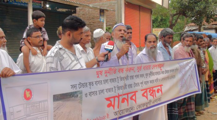 টাঙ্গাইলের সখিপুর সদ্য টেন্ডারকৃত বাসারচালা বাজার হতে জিতাশ্বরী রাস্তা পাকাকরণ না করে টেন্ডার রদবদল করে অন্য জায়গায় স্থানান্তর করার প্রতিবাদে বাসার চালা এলাকার জনসাধারণ মানববন্ধন করেছে। (সোমবার) ২৩জুন বিকেলে বাসার