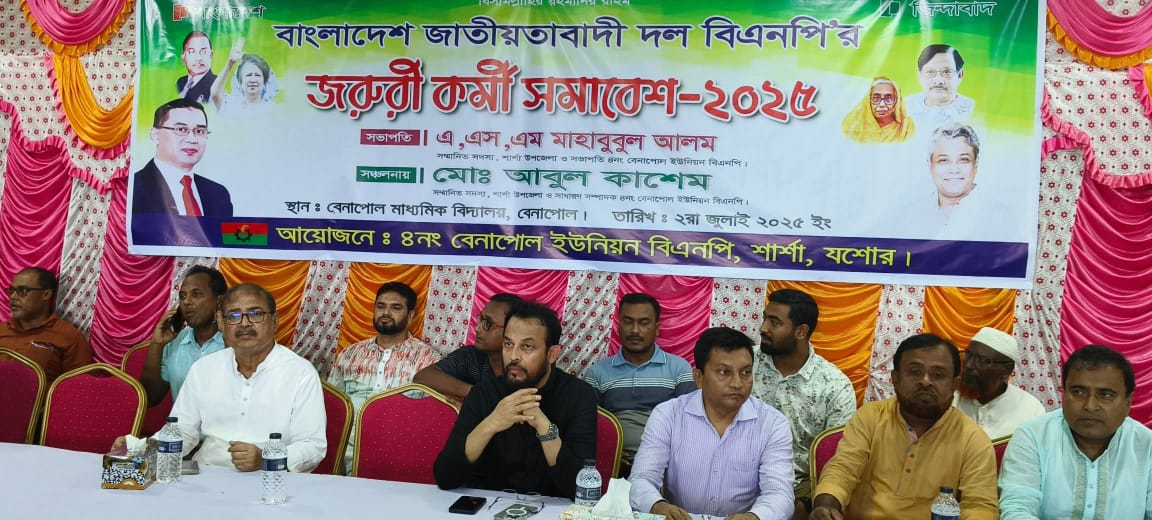 বেনাপোল পৌর বিয়ে বাড়ি প্রাঙ্গণে আজ(২ জুলাই) ৪নং বেনাপোল ইউনিয়ন বিএনপির উদ্যোগে অনুষ্ঠিত হয়েছে বাংলাদেশ জাতীয়তাবাদী দল (বিএনপি)-র এক জরুরি কর্মী সমাবেশ।