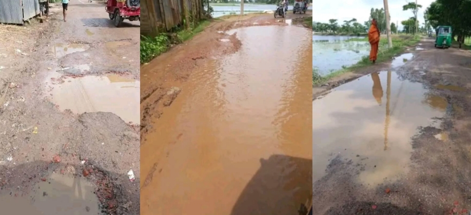 সড়ক। কিন্তু গুরুত্বপূর্ণ এই সড়কটির বেহাল দশা এখন জনদুর্ভোগের অপর নাম। খানাখন্দে ভরা এই রাস্তায় কোথাও কোথাও বড় গর্তে জমে থাকা পানি ছোটখাটো পুকুরে রূপ নিয়েছে।