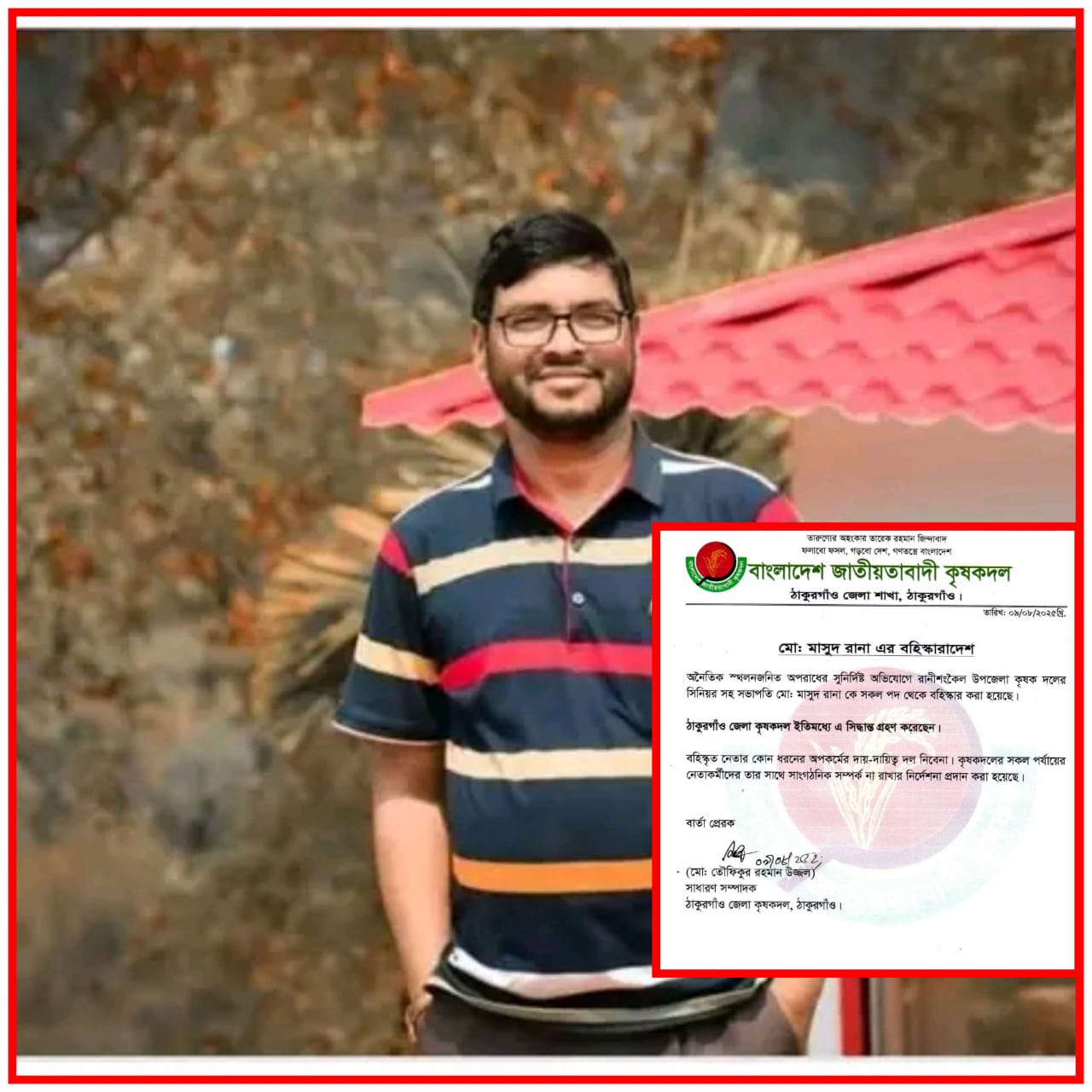 বহিষ্কারাদেশে আদেশে জানানো হয়,অনৈতিক স্খলনজনিত অপরাধের সুনির্দিষ্ট অভিযোগে রানীশংকৈল উপজেলা কৃষক দলের সিনিয়র সহ সভাপতি মো: মাসুদ রানা কে সকল পদ থেকে বহিস্কার করা হয়েছে। বহিস্কৃত নেতার কোন ধরনের অপকর্মের দায়-দায়িত্ব দল নিবেনা। কৃষকদলের সকল পর্যায়ের নেতাকর্মীদের তার সাথে সাংগঠনিক সম্পর্ক না রাখার নির্দেশনা প্রদান করা হয়েছে। ঠাকুরগাঁও জেলা কৃষকদল ইতিমধ্যে এ সিদ্ধান্ত গ্রহণ করেছেন।