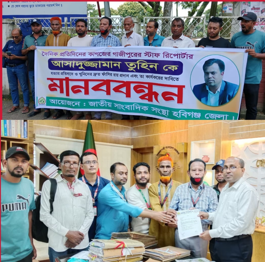 গাজীপুরের দৈনিক প্রতিদিনের কাগজ পত্রিকার স্টাফ রির্পোটার, আসাদুজ্জামান তুহিন হত্যার প্রতিবাদে ও দ্রুত হত্যাকারীদের বিচারের দাবীতে মানববন্ধন ও প্রতিবাদ সভা অনুষ্ঠিত হয়েছে।৷ ১৪ আগষ্ট বৃহস্পতিবার হবিগঞ্জ জেলা প্রশাসকের কার্যলয়ের সামনে দুপুরে